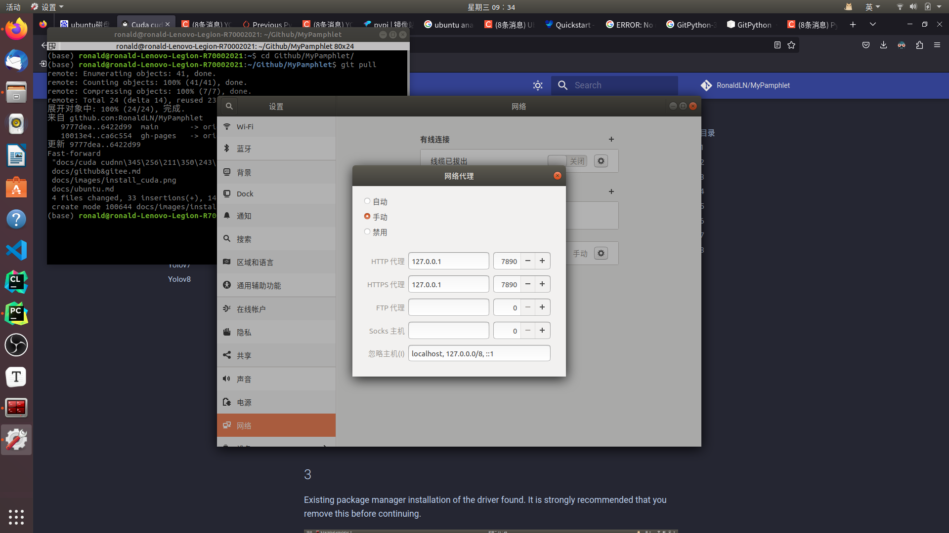 设置,网络,网络代理,手动,填写HTTP代理和HTTPS代理(左127.0.0.1,右7890)