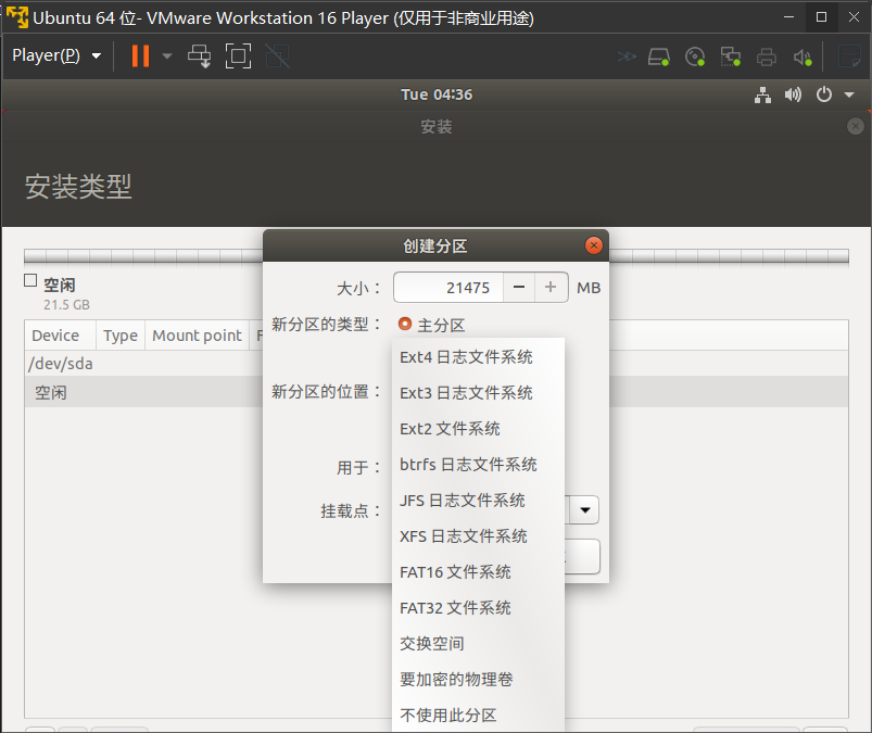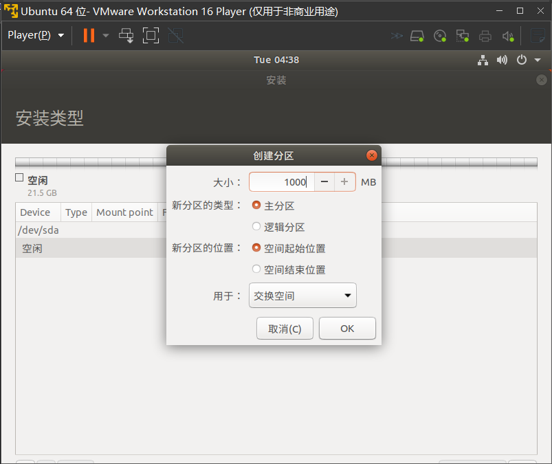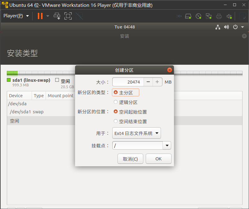 EFI系统分区 300MB --- 交换空间 内存多大就多大 --- 根目录分区 (挂载点: /)剩余空间 Ext4日志文件系统 (若有选项)均选主分区、空间起始位置