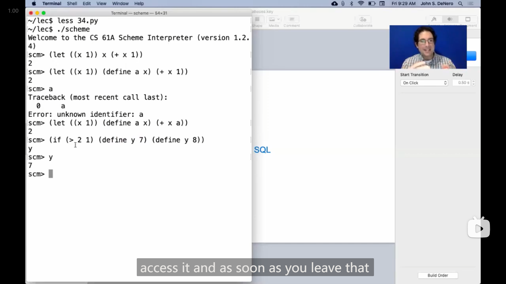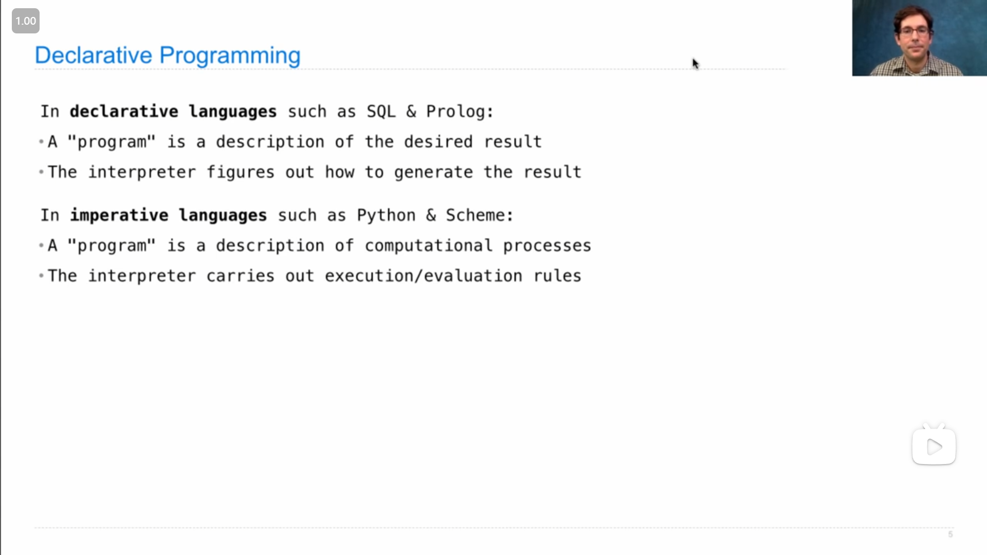 SQL is a declarative programming language. What's that? Well, in a declarative language, SQL is the most common example, but there are many others such as Prolog. A program is a description of the desired result that you want your computer to generate. The interpreter's job is to figure out how to generate that result for you. That's different from an imperative language, such as Python or Scheme. In an imperative language, when you write a program in that language, it's a description of some computational process or processes that you want to be carried out. The job of an interpreter in an imperative language is to carry out the execution and evaluation rules in order to have a correctly interpreted program, and you've done this in your project.