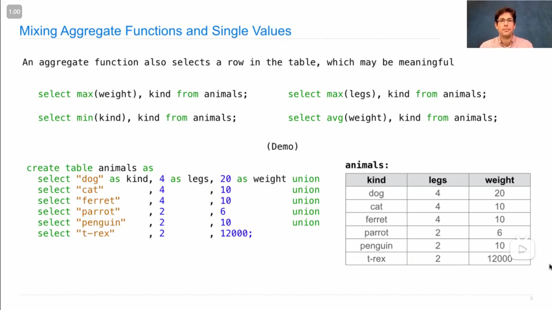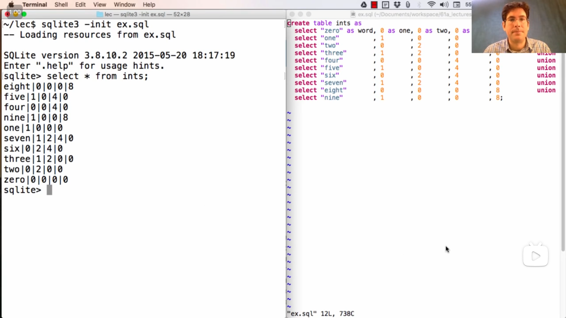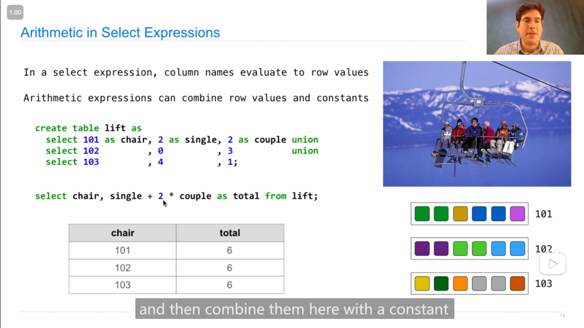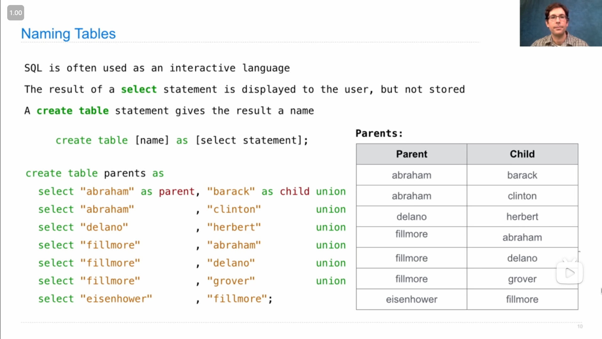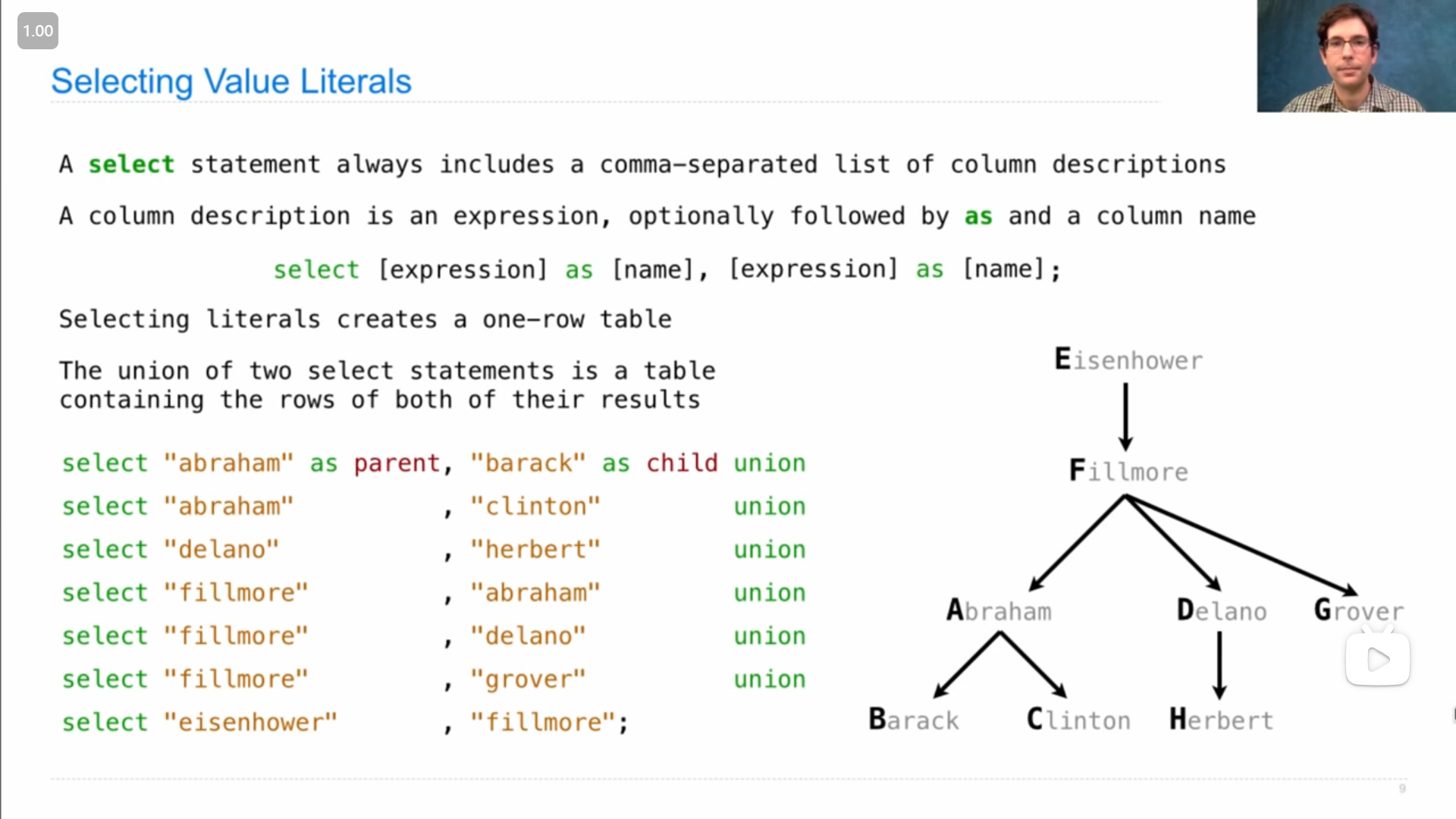 ...If you select literals, which are expressions like the number 2 or the string "Berkeley" , that will create a one-row table. But if you want to create a multi-row table, you can union together two select statements. The union of two select statements is another table, but it contains the rows of both. You can only union together tables that have the same number of columns and the same type of information in each column. But the two select statements that you union together don't need to have the same names for the columns; it will just use the names of the first select statement in order to name the columns in the final result.