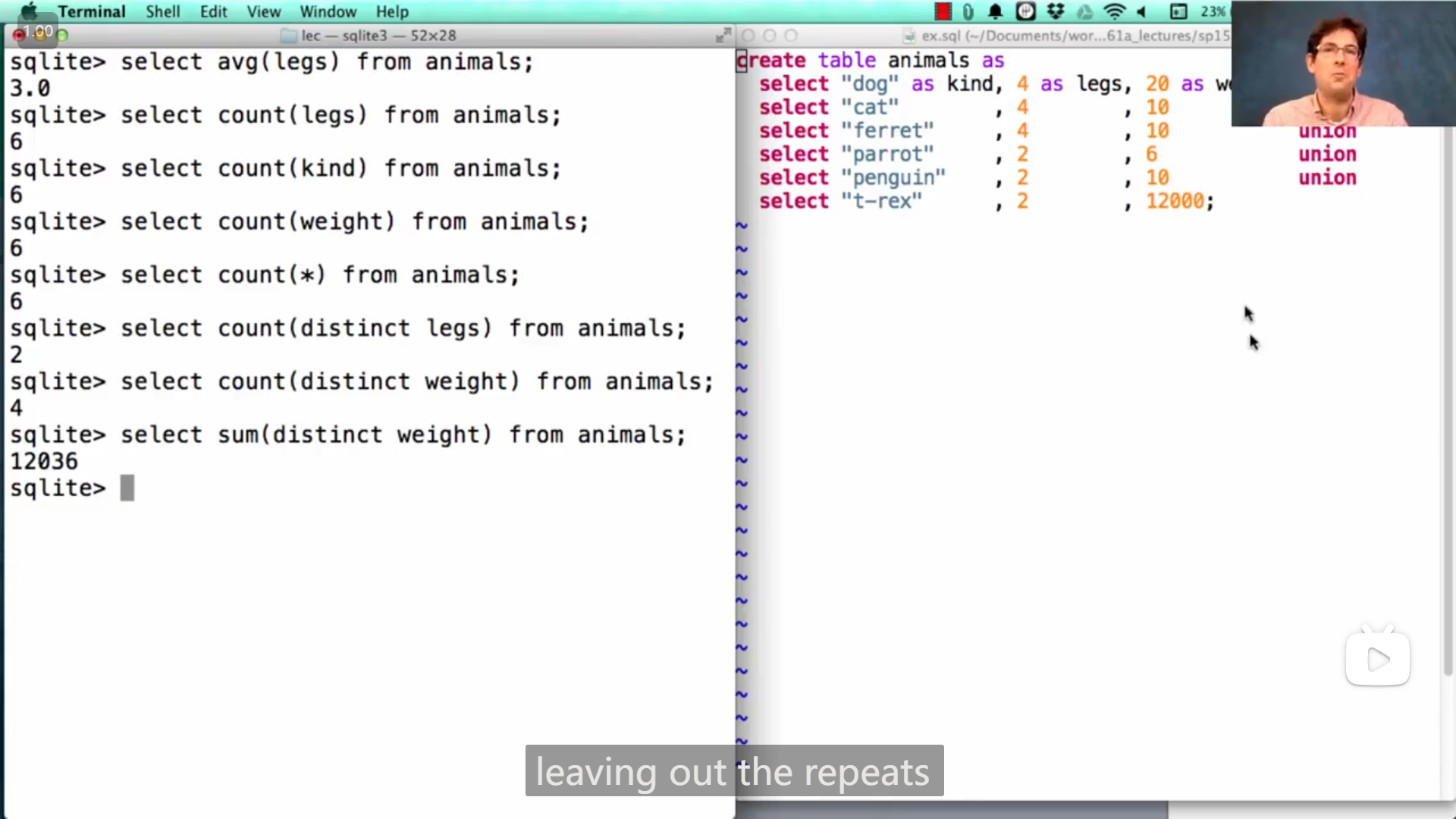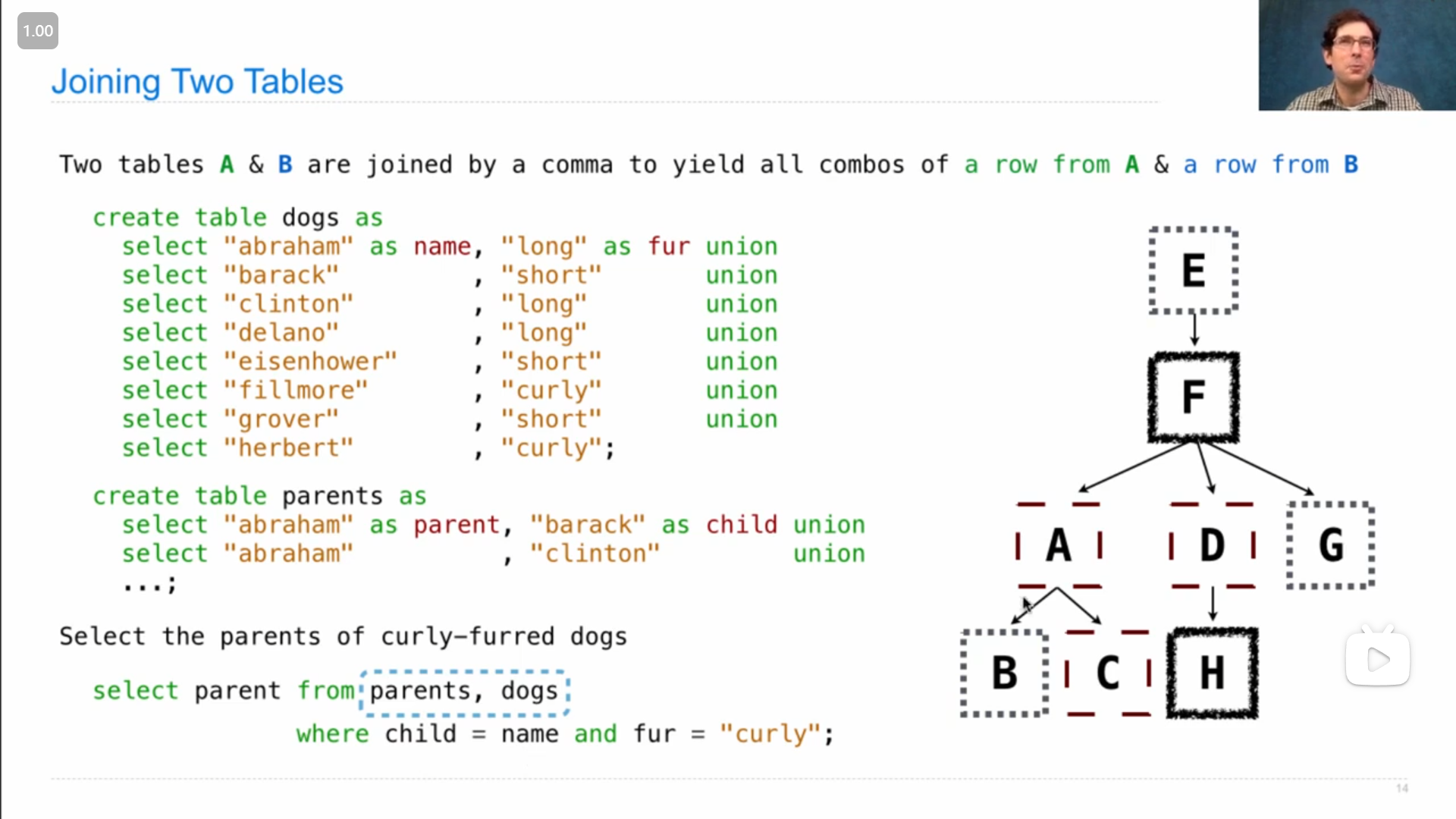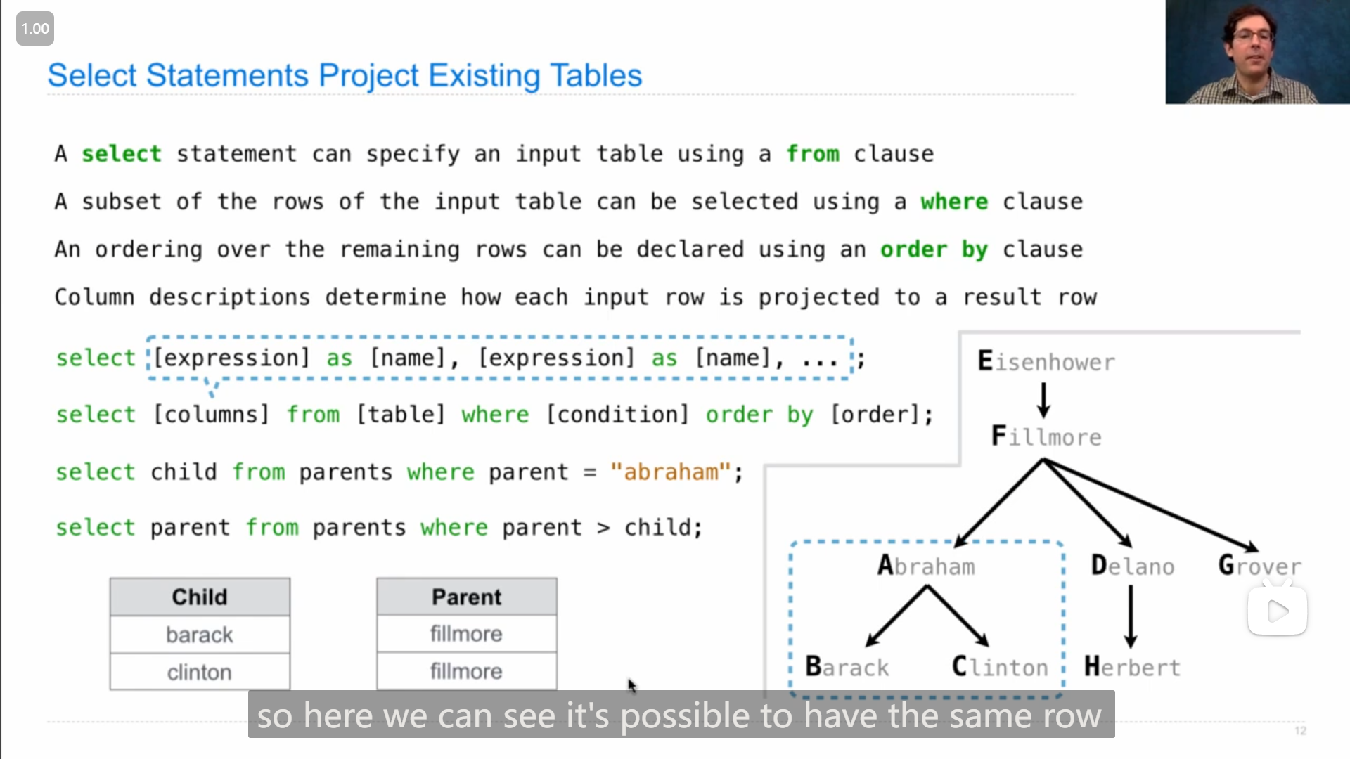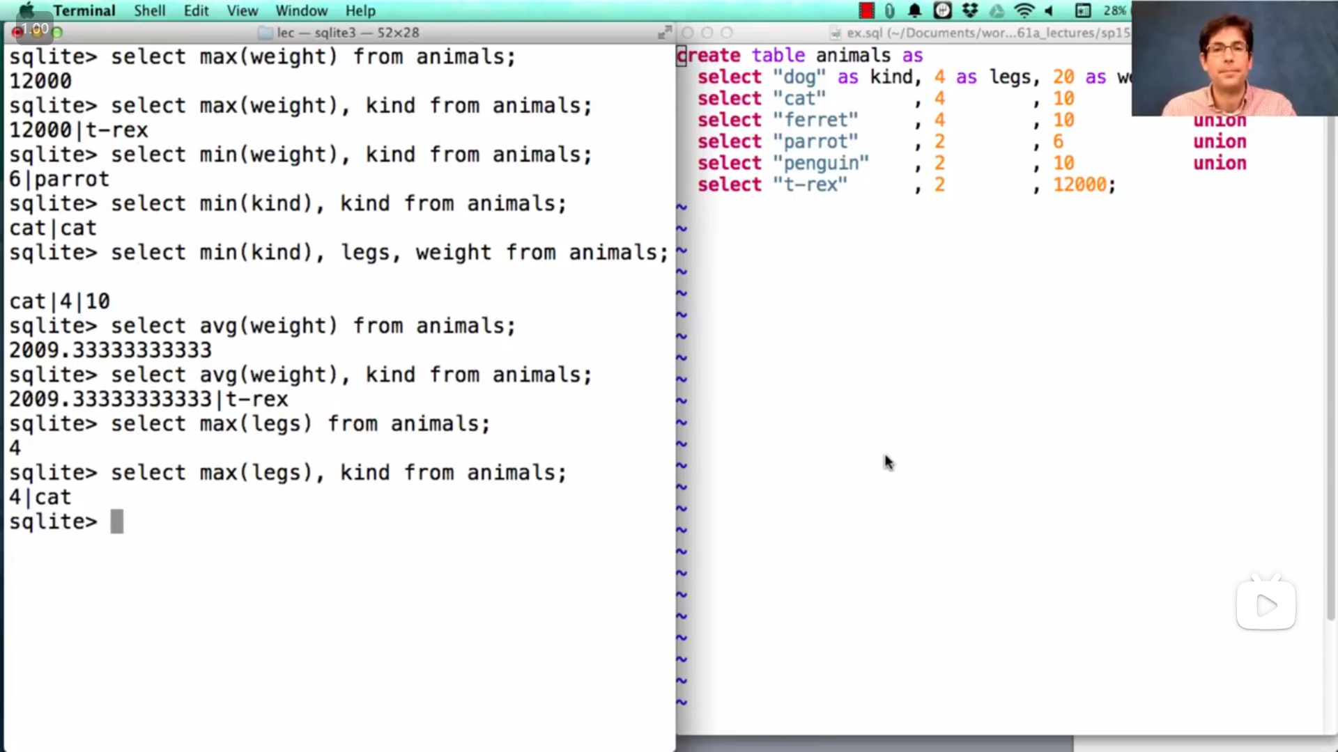 ...If you select literals, which are expressions like the number 2 or the string "Berkeley" , that will create a one-row table. But if you want to create a multi-row table, you can union together two select statements. The union of two select statements is another table, but it contains the rows of both. You can only union together tables that have the same number of columns and the same type of information in each column. But the two select statements that you union together don't need to have the same names for the columns; it will just use the names of the first select statement in order to name the columns in the final result.