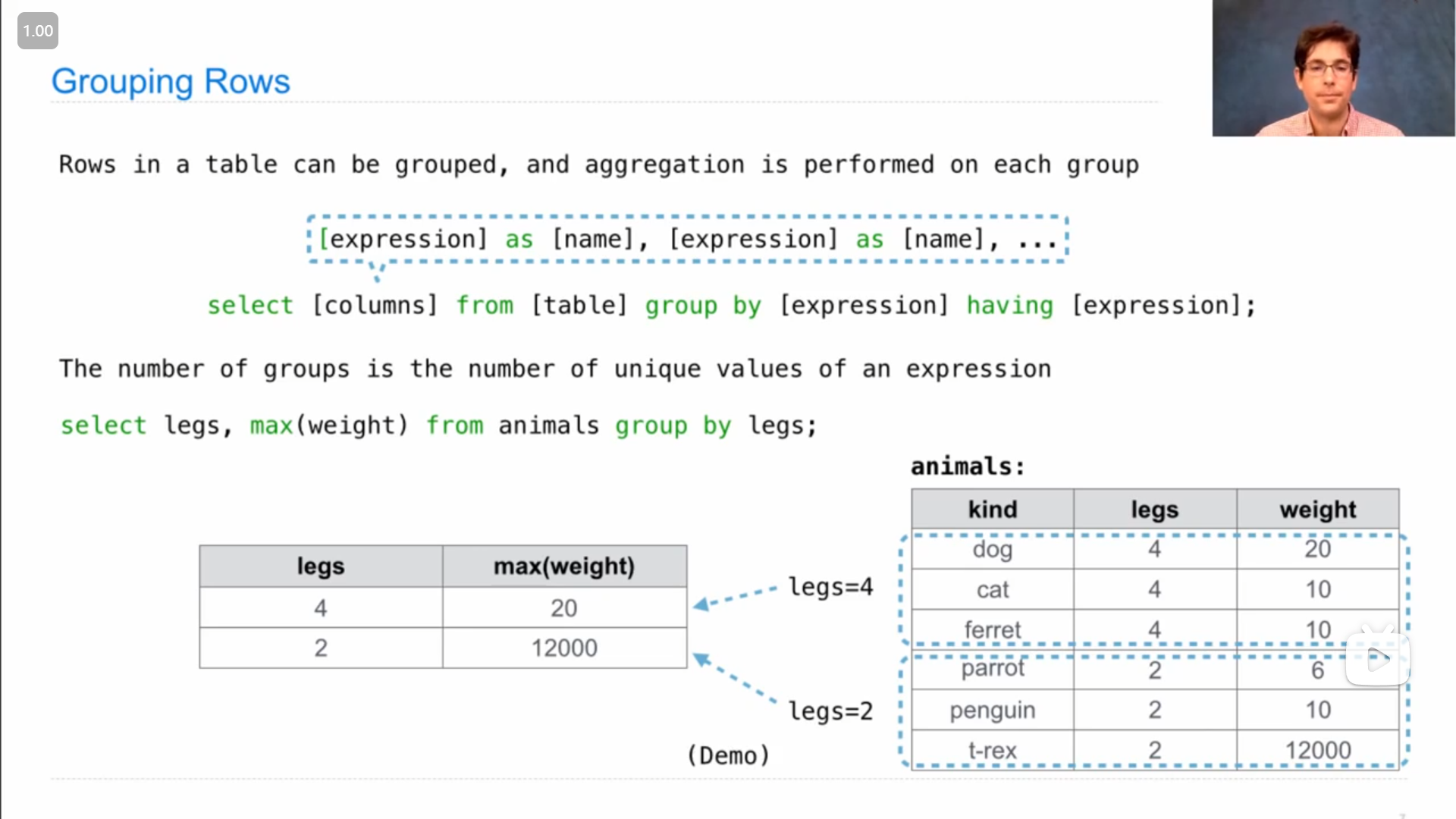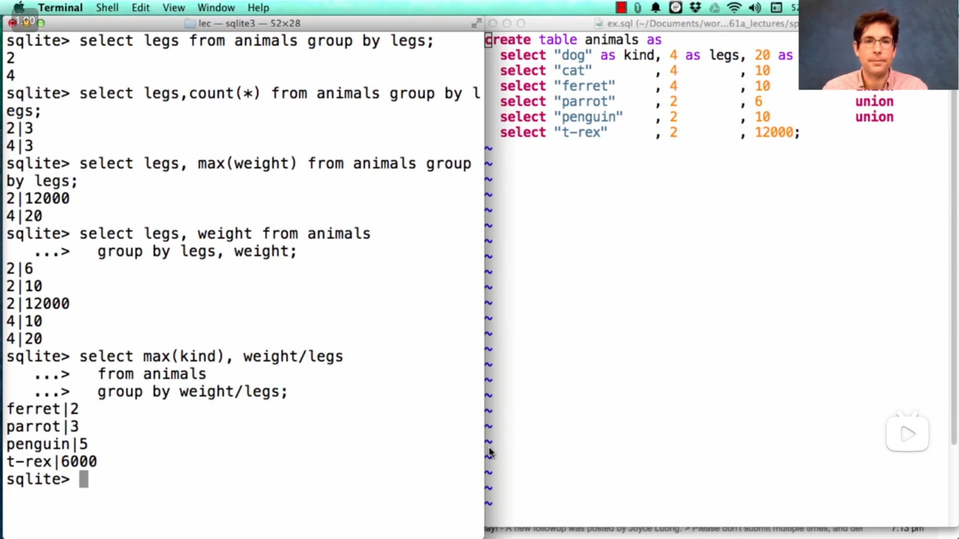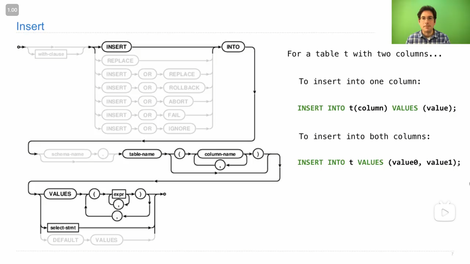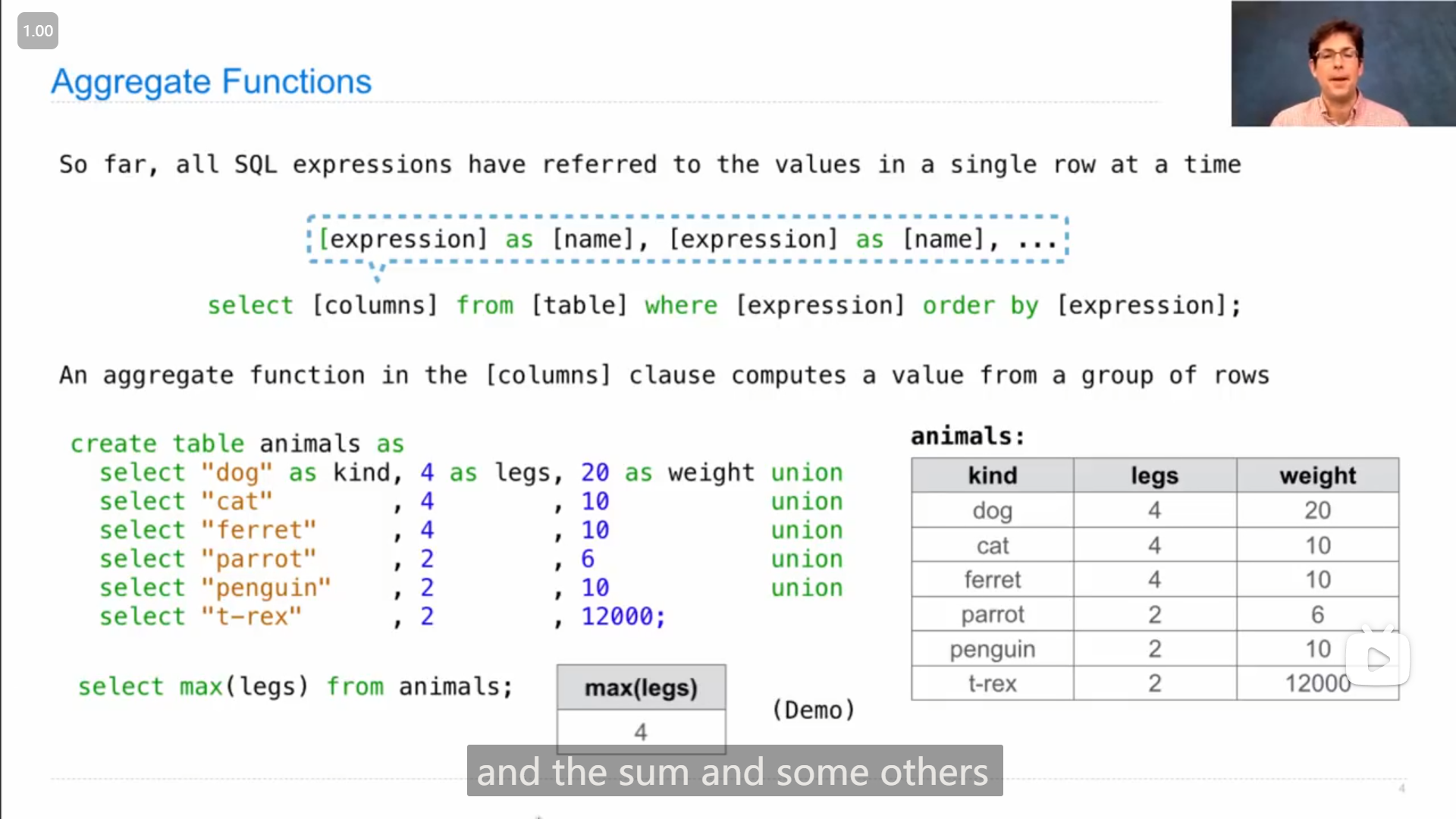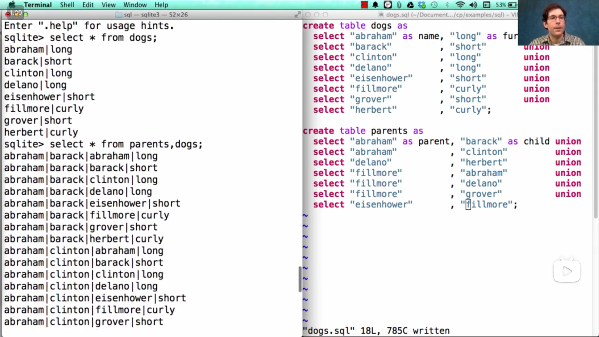...If you select literals, which are expressions like the number 2 or the string "Berkeley" , that will create a one-row table. But if you want to create a multi-row table, you can union together two select statements. The union of two select statements is another table, but it contains the rows of both. You can only union together tables that have the same number of columns and the same type of information in each column. But the two select statements that you union together don't need to have the same names for the columns; it will just use the names of the first select statement in order to name the columns in the final result.