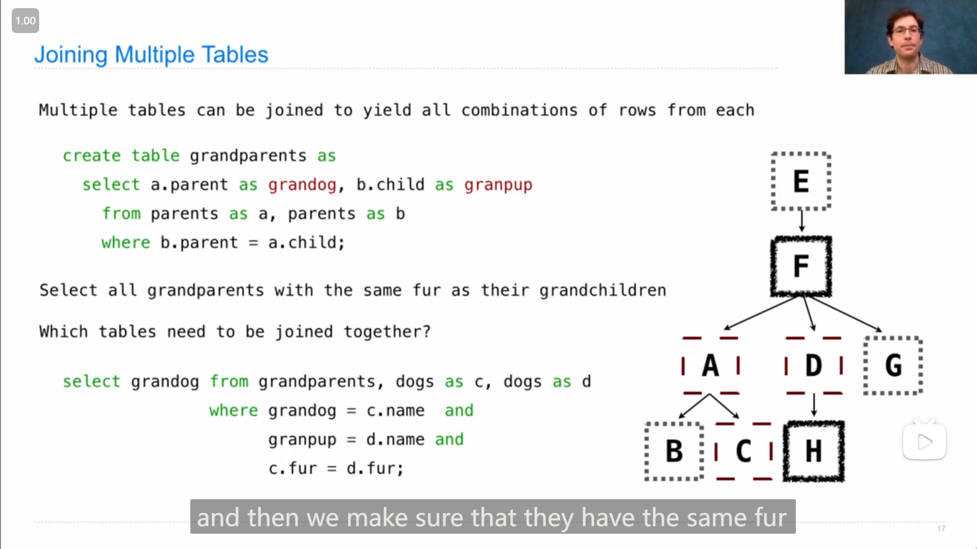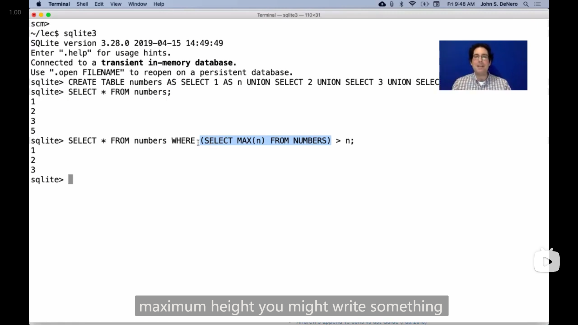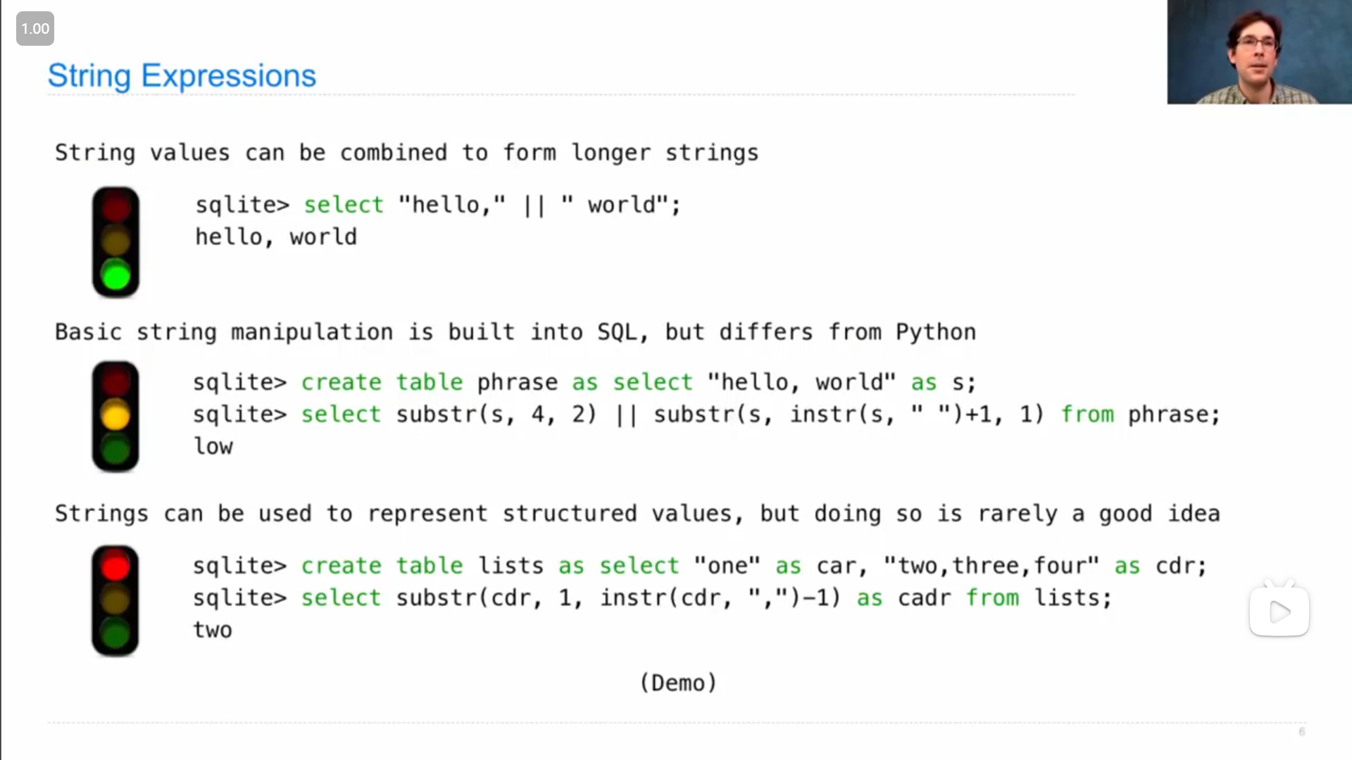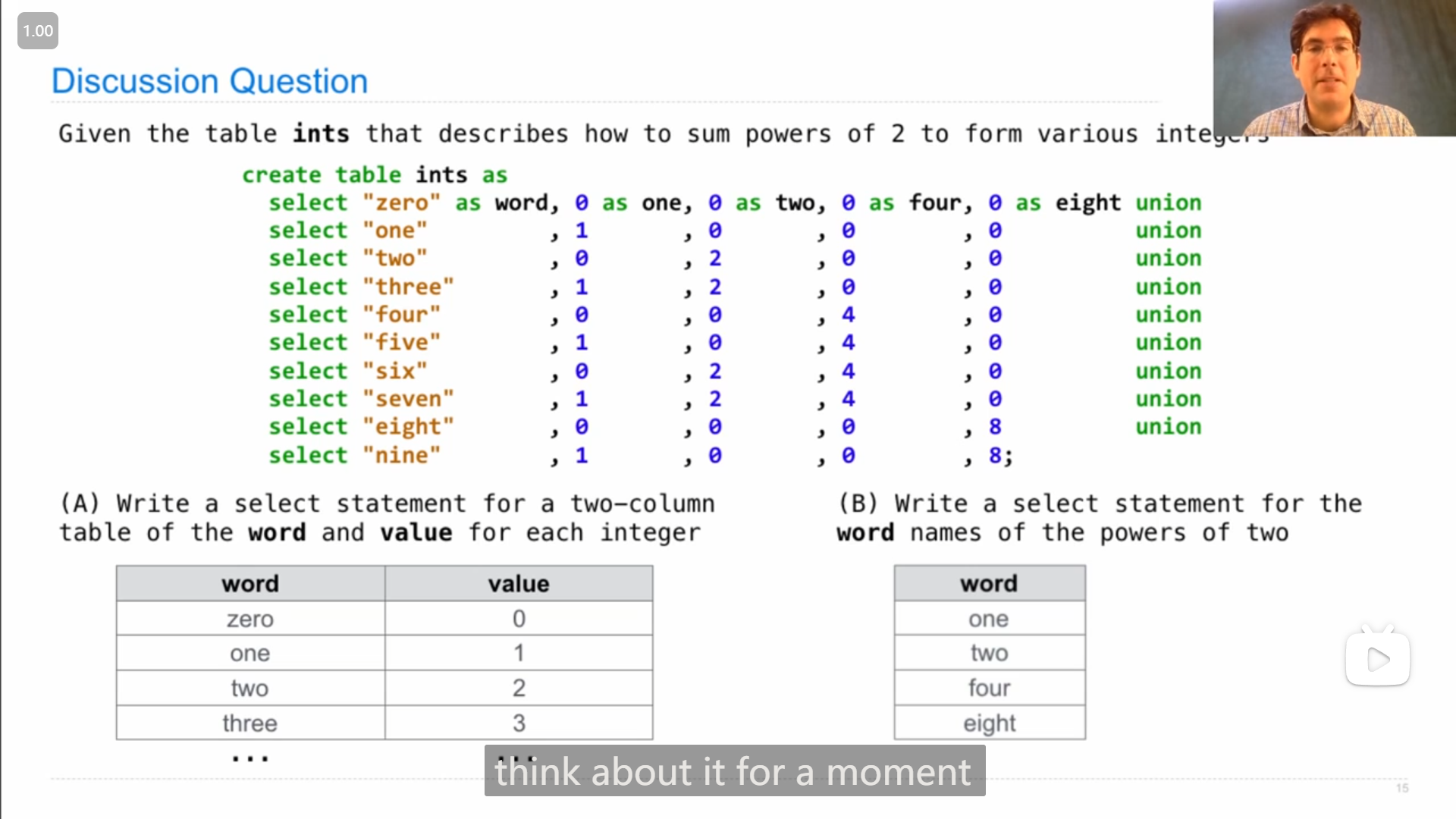 ...如果你选择( select )字面量,这些表达式可以是像数字 2 或字符串 "Berkeley" 这样的表达式,那将创建一个一行的表。但如果你想创建一个多行的表,你可以将两个 select 语句联合在一起。两个 select 语句的联合是另一个表,但它包含了两者的行。你只能联合那些具有相同列数和每列相同类型信息的表。但你联合在一起的两个 select 语句的列名不需要相同;它将只使用第一个 select 语句的列名来命名最终结果中的列。