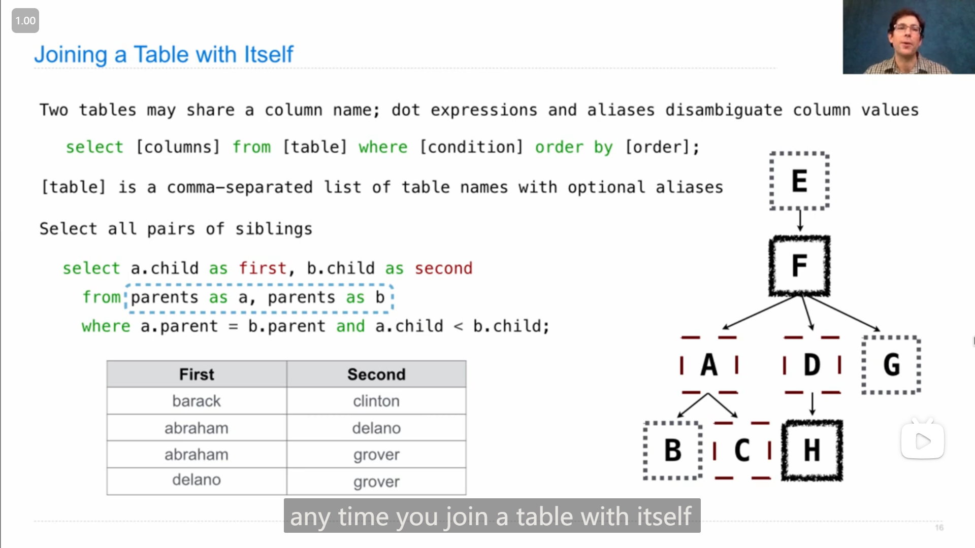 如果遇到不同的表有相同名字的列,或者需要使用同一个表(如上图),就需要使用 别名 alias ( from [table] as [alias] ),然后使用 点表达式 . 来使用不同表/别名中的相同名字的列