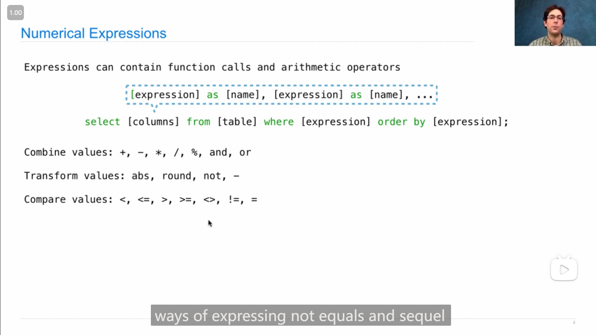 其中不等号有两种 <> 和 != ,而等号是 = (和python中的 == 不一样)