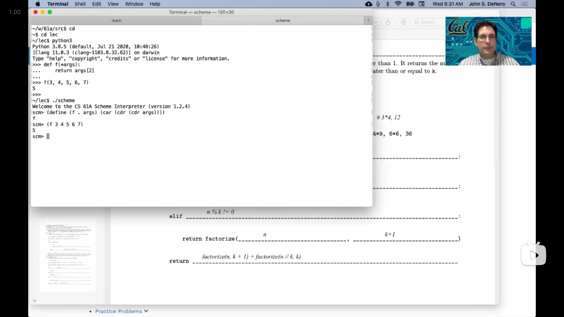 John提到scheme中也有类似python中 *args 的传入不定个数参数的方法,在定义函数时,可以使用 . args 的形式来获取所有的参数(可见于下图),然后 args 就会是一个链表